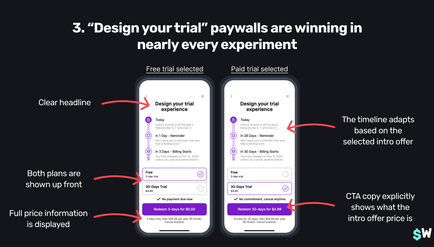 Design your trial paywalls: In our tests, these are winning nearly every single time. One hypothesis as to why? It gives users control over something they've not previously had control over — the terms of the trial.